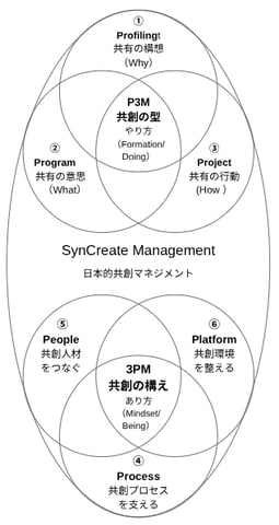 「共生的共創」とは、「共有の構想 (Shared Concept)」「共有の意思 (Shared Plan)」「共有の行動 (Shared Action)」からなる価値創造ですから、共有の構想を、① Profiling Management(プロファイリングマネジメント)が、共有の意思を、② Program Management(プログラムマネジメント)が、共有の行動を、③ Project Management (プロジェクトマネジメント)が、担います。